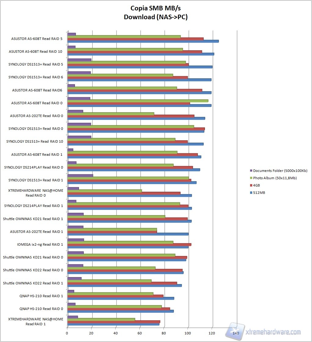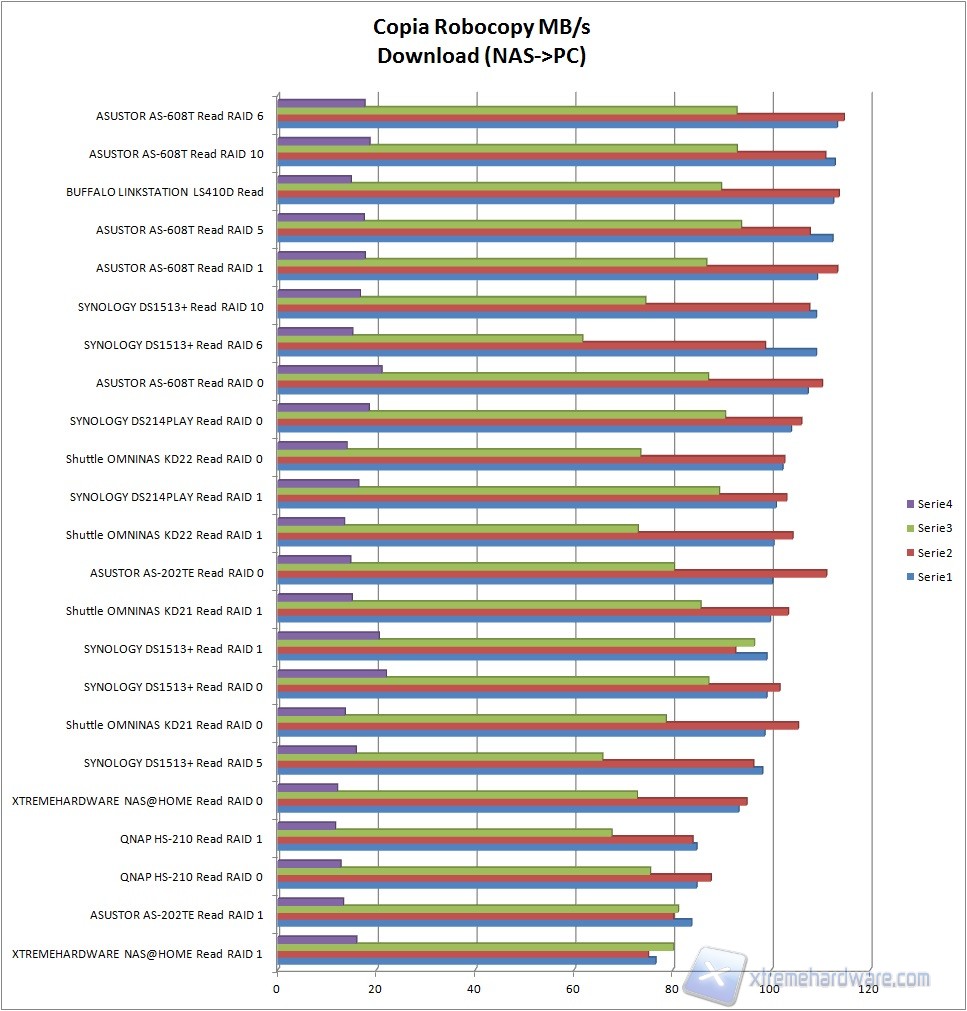 In lettura, per noi download, le cose cambiano leggermente;  il nostro NAS@HOME va infatti a ricoprire l'ultima posizione e la quint'ultima, facendo registrare valori massimi pari a 94,6MB/s... non proprio male direi!