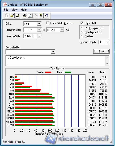 Vediamo qui come il transfer rate, sia in lettura che scrittura, tenda quasi all'ottimo valore di 110 MB/s, tranne che i risultati ottenuti con blocchi più piccoli, che registrano prestazioni inferiori.