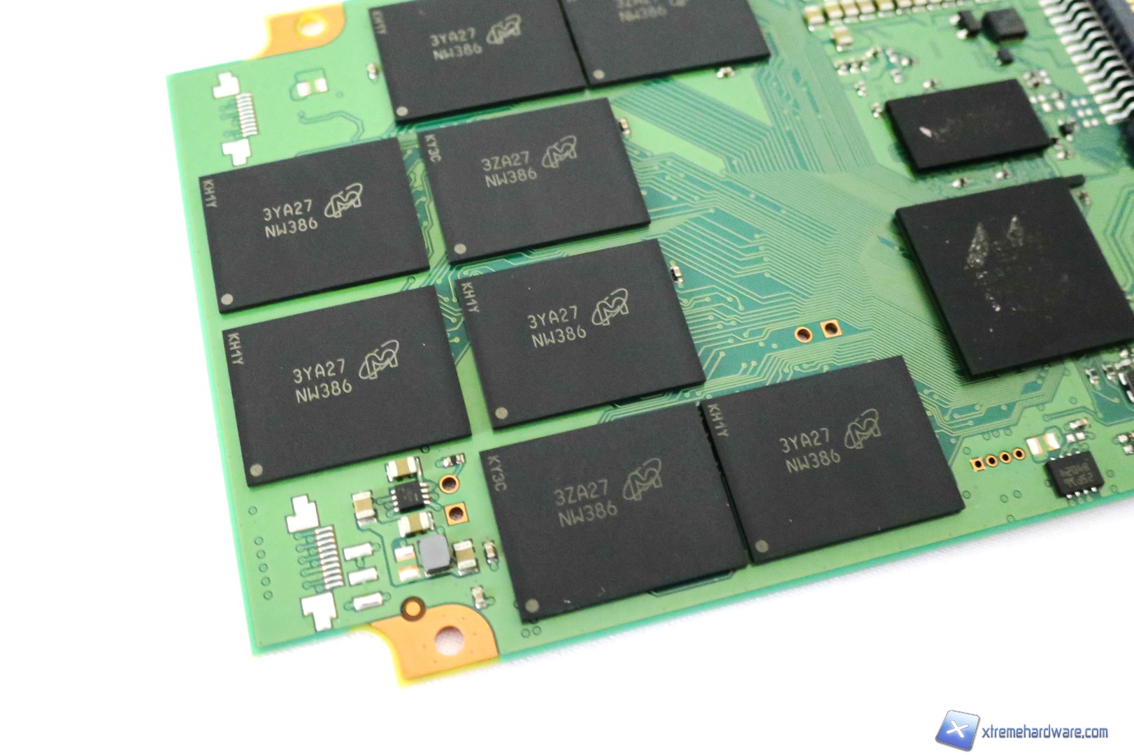Soffermandoci sui chip di memoria, troviamo 8 chip Toggle NAND 2.0 di tipo MLC con riportato il logo Micron e il codice in questo caso NW386. Si tratta di chip di memoria MLC realizzati con processo produttivo a 20nm la cui sigla completa è Micron MT29F256G08CECAB. Quindi abbiamo 8 chip NAND con una capacità di 32GB per ciascun chip per un totale di 256GB. Tali chip sono ovviamente prodotti da Micron ed impiegati in moltissimi SSD tra cui gli stessi Crucial/Micron. Il TBW per questo SSD è di 72TB, un valore buono che non ci farà temere l'usura delle celle anche con utilizzi frequenti del disco.