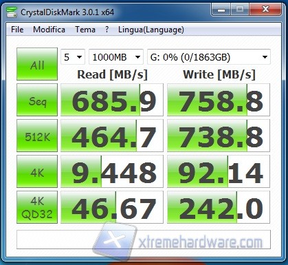 Nella modalità Maximum Performance il WD Green ottiene un soprendente boost grazie ai due Vertex 4 che però non sono stati sfruttati a pieno a livello di cache per una limitazione del controller. Possiamo comunque notare le ottime prestazioni di lettura e scrittura anche nel sequenziale, decisamente più elevate in confronto al singolo WD Green meccanico. In scrittura raggiungiamo infatti la velocità di circa 760 MB/s e vicina ai 700 MB/s anche in lettura. In questa modalità si mantengono buoni anche i valori con file size più piccoli rendendo così il Green un ottimo disco di storage.